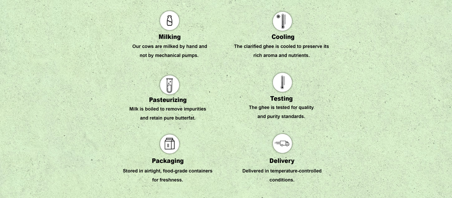 From hand-milking cows to careful pasteurization, cooling, and quality testing, our ghee is crafted with the utmost care to retain its rich aroma, nutrition, and purity. Stored in airtight, food-grade containers and delivered in temperature-controlled conditions, we ensure that every jar of our ghee is as fresh and wholesome as nature intended. Experience the goodness of tradition in every spoonful!